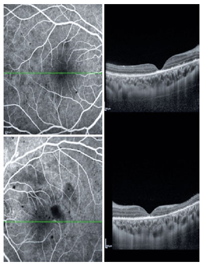 After 2 months, the patient returned for a multimodal study of the retina, which revealed bilateral foveal atrophy of the entire retina and significant temporal inner retinal thinning in the left eye (Figures 2, 3 and 4). It was not possible to perform the multimodal analysis at the onset of the ocular condition as the patient was hospitalized in an intensive care unit in a serious condition, which made her displacement impossible. After 4 months, the patient’s best-corrected visual acuity was 20/50 in the right eye and 20/200 in the left eye. At this time point, no changes were observed on biomicroscopy, while the fundoscopy revealed mild optic disc pallor, preserved vessels without hemorrhage, dry macula, heterogeneous retina color, and clear vitreous body.