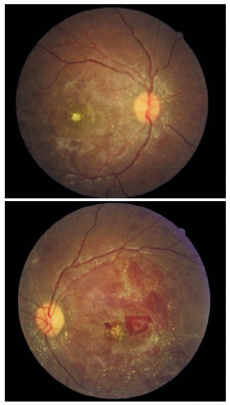 The patient was accordingly started on ceftriaxone. On the fifth day of hospitalization, the patient woke up with headache, vomiting and complaints of severely reduced visual acuity in both her eyes. A lumbar biopsy revealed presence of turbid inflammatory fluid. The ophthalmological findings were visual acuity of hand motion in both eyes and the fundoscopy revealed exudates, diffuse hemorrhages and vascular sheathing affecting the entire retina, all of which confirmed the diagnosis of FBA in both eyes (Figure 1). Cranial magnetic resonance angiography revealed areas of signal alteration in the thalamus and corpus callosum with the evidence of retinal and cerebral vasculitis.