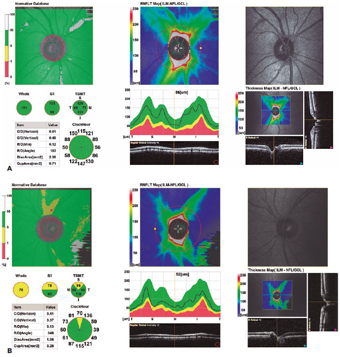 In the SFCT evaluation, statistically significant difference was noted among the groups 1, 2, and healthy controls (p<0.001). In post-hoc analysis, the mean SFCT was 250.24 ± 68.34 µm in group 1 and 216.72 ± 71.24 µm in group 2; this difference was statistically significant. The mean SFCT in the control group was 273.64 ± 77.68 µm, which was significantly greater than that in groups 1 and group 2. Figures 1A and 1B illustrate the SCFT images from a healthy control and a group 1 patient. The average pRNFLT was 100.34 ± 8.24 µm in group 1, 95.44 ± 6.67 µm in group 2, and 102.34 ± 8.24 µm in the control group. Figures 2A and 2B depict the pRNFLT images of 1 subject each from the control group and from group 2. The mean pRNFLT was significantly lesser in group 2 patients than in group 1 patients and the control subjects (p=0.042 and p=0.036, respectively), albeit the difference in the thicknesses between group 1 and the control group was not statistically significant. Analyses of the pRNFL quadrants parameters revealed that all quadrant thicknesses in group 2 were significantly lesser than those in group 1 patients and control subjects. The comparative analyses are depicted in table 2.