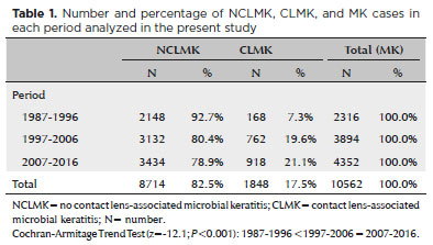 Métodos: Amostras de córnea de pacientes com diagnóstico clínico de ceratite microbiana (de janeiro de 1987 a dezembro de 2016) foram incluídas neste estudo. Resultados laboratoriais para culturas positivas para bactérias, fungos e Acanthamoeba spp. foram analisados retrospectivamente. Para verificar se o número de pacientes com ceratite microbiana associada à lente de contato, fator de risco para infecção microbiana, mudou ao longo do tempo, a análise foi dividida em três décadas: 1987-1996, 1997-2006 e 2007-2016. As informações incluindo o sexo do paciente, idade e tipo de organismo isolado foram comparadas entre os períodos. A análise estatística foi realizada no software SAS/STAT 9.3 e SPSS (v20.0).