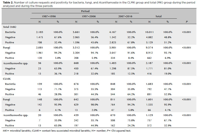 We analyzed the corneal scrapings from 10.562 patients who received a clinical diagnosis of MK from January 1987 to December 2016. Among these patients with keratitis, 1.848 (17.5%) had CLMK. During the three periods analyzed, the incidence of MK and CLMK increased; however, the increase in CLMK was statistically significant from the first to the second decade, from 7.3% to 19.6% (p<0.001) (Table 1). The increase in MK positivity was accompanied by an increase in culture requests at our Medical Center.