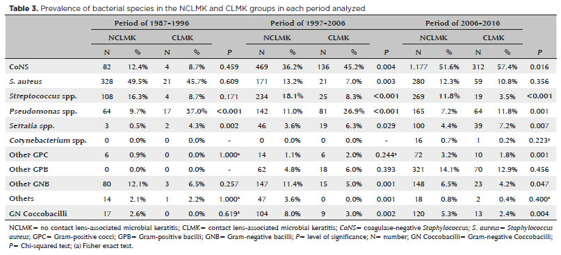 Staphylococcus spp. was the most frequent Gram-positive bacterium isolated from samples from both the NCLMK and CLMK groups. Among Gram-negative bacteria, Pseudomonas spp. was most frequently isolated from samples of both groups. Among Staphylococcus spp., S. aureus was the most frequently isolated agent from NCLMK (49.5%) and CLMK (45.7%) samples in the first period (1987-1996). However, in the second and third periods (1997-2006 and 2007-2016, respectively), coagulase-negative Staphylococcus (CoNS) was the most commonly isolated bacteria from the NCLMK group (36.2% and 51.6%, respectively) and the CLMK group (45.2% and 57.4%, respectively). Streptococcus spp. was more frequent in the NCLMK group compared with the CLMK group in the second and third periods (p<0.001). Pseudomonas spp. was more common in the CLMK group in the first and second periods (p<0.001) (Table 3).