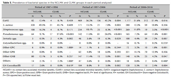 Gram-negative bacilli are commonly isolated from CLMK samples in tropical countries, whereas Gram-positive bacteria are more common in countries with a temperate climate(10). Staphylococcus spp. was the most frequent species in the corneal samples of the NCLMK and CLMK groups in the current study. This was surprising because Brazil is a tropical country; thus, Pseudomonas spp. would be expected to be the most commonly isolated bacteria(14-16). However, its location at the Tropic of Capricorn at a considerable elevation provides a rather subtropical-to-temperate climate to São Paulo. Conversely, Pseudomonas spp. was the major causative agent of bacterial CLMK in our experience (p<0.001).
