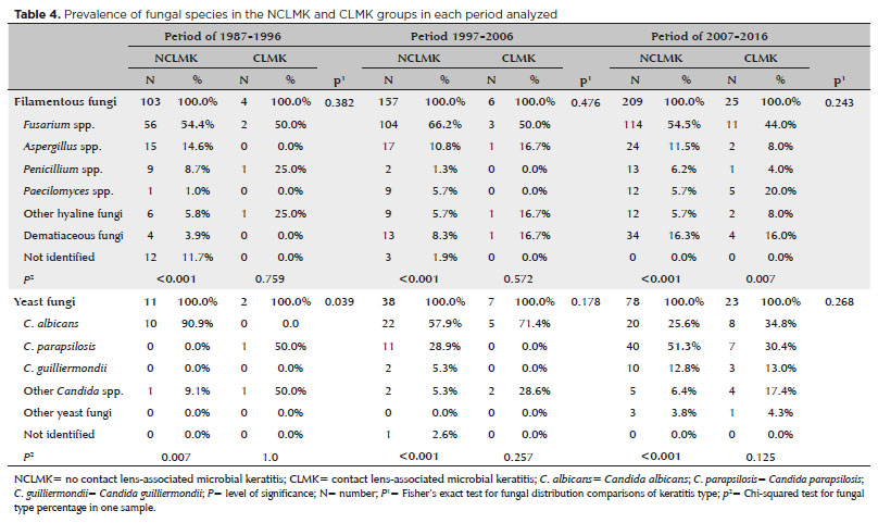 Among all positive fungal cultures, filamentous fungi were the most frequent in all three periods for the MK group. Fusarium spp. was the most common filamentous species isolated from the NCLMK group for all three periods (>70%; p<0.001). Candida albicans was the most frequent yeast species isolated from the NCLMK group samples in the second period (p<0.001), which C. parapsilosis was the most frequent yeast species isolated in the third period for this group (p<0.001) (Table 4). In the CLMK group, Fusarium spp. was the most common filamentous species isolated for all three periods, while C. albicans was the most frequent yeast species in the second and third period. However, this difference was not statistically significant.