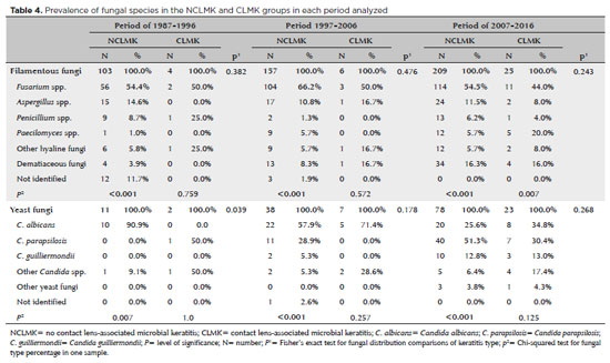The results of this study demonstrated that, among patients with MK, fungal infection was less common than bacterial infection; there was one fungal case for every eight bacterial cases. The probable explanation for this finding relies on the level of urbanization of São Paulo, as a higher percentage of fungal MK cases would be expected in rural environments(29). Fusarium spp., Aspergillus spp., and Candida spp. are the most commonly isolated fungi worldwide in cases of corneal infection(30,31). In the present study, we were able to demonstrate a higher frequency of filamentous fungal infection in the MK group from 1987-2016, with Fusarium spp. being the predominant fungal species.