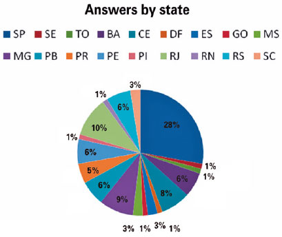 After sending the questionnaires, 79 responses were obtained in compliance with the Free and Clarified Consent Form. The survey response rates of the course coordinators according to the distribution of the Brazilian regions were as follows: 1.3%, Northern region; 30.4%, Northeast region; 5.1%, Midwest region and Federal District; 49.3%, Southeast region; and 13.9% in Southern region. The answers by state are shown in figure 1.