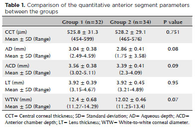 None of the patients had coexisting ocular symptoms. No abnormalities of the cornea, anterior chamber, or posterior segment were found in the slit-lamp examination. When compared, the values of the quantitative AS parameters were not significantly different between the groups (Table 1).