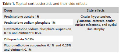 Corticosteroids at the top of the inflammatory cascade, downregulating many inflammatory mediators, partly via inhibition of the phospholipase A2 and cyclooxygenase-2 activities(4). Corticosteroid eyedrops are used primarily for anterior uveitis. The administration frequency is defined by the grade of anterior chamber inflammation and may range from every hour to once every other day, usually initiated intensively, with slow tapering over weeks to months(3). The commonly used drugs are dexamethasone and prednisolone acetate, the latter reaching higher concentrations in the aqueous humor(5). Difluprednate has been demonstrated to reach the posterior segment at significant concentrations and is effective in the treatment of cystoid macular edema(6,7). Difluprednate causes higher elevations of intraocular pressure(7,8), whereas less potent corticosteroids, such as fluorometholone and loteprednol, have less impact on intraocular pressure but are also not as effective in tackling inflammation(9). Other common side effects of topical corticosteroids include cataract and glaucoma. Table 1 presents the most commonly used topical corticosteroids.