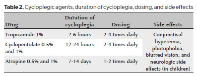 Tropicamide, cyclopentolate, and atropine are cycloplegic drops prescribed to reduce ciliary spasm and the associated ocular pain and photophobia, and to prevent the development of posterior synechiae in the setting of anterior uveitis(3). Cyclopentolate should be used cautiously in young children under 6 years because of the risk of central nervous system disturbances(12). The duration of cycloplegia for each drug is described in table 2. Tropicamide has a less potent and shorter cycloplegic effect, making it a popular choice(13).