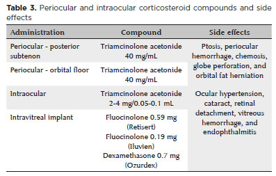 26. Thorne JE, Sugar EA, Holbrook JT, Burke AE, Altaweel MM, Vitale AT, et al. Periocular triamcinolone vs.intravitreal triamcinolone vs. intravitreal dexamethasone implant for the treatment of uveitic macular edema: the PeriOcular vs. INTravitreal corticosteroids for uveitic macular edema (POINT) Trial. Ophthalmology. 2019;126(2):283-95.