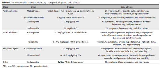 When an oral prednisone dose >5 mg/day is required beyond 3 months or when inflammation persists despite corticosteroid use or corticosteroid use is not tolerable, immunomodulatory therapy is the next treatment approach(36). Immunomodulators modify the immune response through different pathways in conjunction with the corticosteroid-sparing effect. As it may take several weeks to months for immunomodulatory therapy to control inflammation, concomitant corticosteroid use is advised until the full effect is achieved.