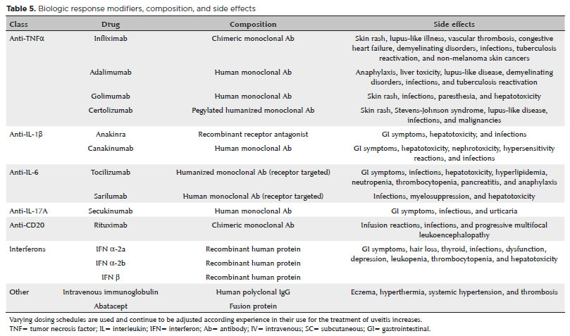 When an immunomodulatory drug is not effective in suppressing inflammation, the dose may be increased to the maximum tolerated, or the drug may be combined with or replaced by another drug. The frequent combinations are antimetabolites with T-cell signaling inhibitors or biologic agents(34,39). Simultaneous use of two immunomodulatory drugs from the same category is not recommended because of the increased risk of side effects. Intraocular inflammation should be inactive for at least 2 years before tapering and withdrawing the immunomodulatory therapy(3). The conventional and biologic immunomodulatory drugs used to treat uveitis are presented in tables 4 and 5, respectively.