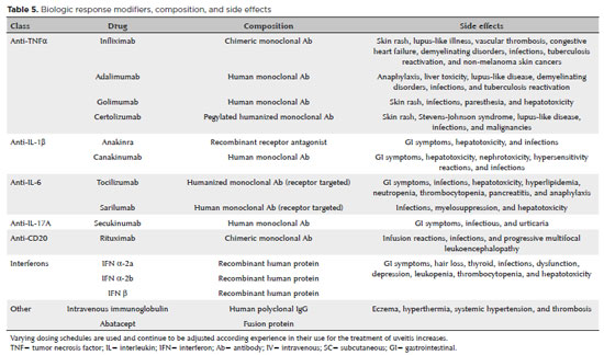 Immunomodulatory therapy is divided into conventional and biologic response modifier drugs. Biologic response modifiers, or “biologics”, are a class of immunomodulatory drugs that target different inflammatory molecules such as interleukins (IL) and TNF-α. Biologic response modifiers are usually second-line to the conventional immunomodulatory drugs for the treatment of recalcitrant cases of noninfectious uveitis.