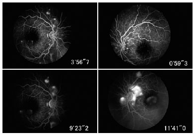 A 23-year-old woman was referred to the ophthalmology center with the complain of bilateral progressive visual acuity (VA) loss since past 4 days. On ophthalmologic examination, her best corrected VA was 20/400 for both the eyes. Pupillary direct reflex was present, albeit weak, and there was no relative afferent pupillary defect, while the extraocular motility was normal. The anterior segment revealed no hyperemia, but remarkable chemosis, without anterior chamber cells or flare. The fundus examination revealed bilateral retinal detachment around the disk and macula with neither peripheral tears nor vitreous reaction (Figure 1). Fluorescein angiography (FA) demonstrated subretinal fluid pooling with multiple points of leakage at the retinal pigment epithelium (RPE) in the corresponding SRD (Figure 2). A B-scan ultrasound did not reveal posterior scleritis, such as retinochoroidal scleral thickening, T-sign, or sub-Tenon’s fluid. The optical coherence tomography (OCT) revealed subretinal fluid with small hyper-reflective areas under the neural retina and above the RPE (Figure 3). The subfoveal choroidal thickness was 276 OD and 277 OS. The ocular alterations were compatible with choroidopathy, and further investigation clarified the etiopatogenesis. The patient’s vital signs included a heart rate of 100, blood oxygen saturation of 91%, blood pressure of 110/50 mmHg, axillary temperature of 36.2oC, and normal respiratory rate. Her laboratory tests revealed hemoglobin level of 11.8 g/L, erythrocyte sedimentation rate (ESR) of 76, and serum albumin level of 2.2 g/dL. The results of daily proteinuria to investigate the hypoalbuminemia was 1,185.8 mg/24 h. The Coombs test results revealed autoimmune hemolytic anemia. The immunological profile indicated positive antinuclear antibodies (1/160). Due to the nephrological disorder, a renal biopsy was performed, which revealed a lupus nephritis type III, indicating SLE.