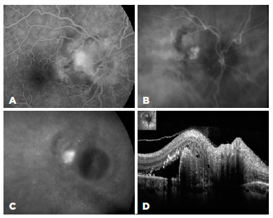 Relatamos um caso de uma paciente de 54 anos com hipertensão intracraniana que apresentava achados atípicos de papiledema unilateral e vasculopatia polipoidal da coroide peripapilar. A investigação levou ao diagnóstico de hipertensão intracraniana idiopática e de um pequeno meningioma incidental. A paciente foi tratada com acetazolamida por via oral, seguida de três injeções intravítreas mensais de bevacizumabe, resultando em inatividade da vasculopatia polipoidal da coroide, redução da exsudação e completa absorção do líquido subretiniano. A apresentação deste caso serve para documentar pela primeira vez vasculopatia polipoidal da coroide associada a papiledema. Ele também demonstra que podem ocorrer anormalidades vasculares da coroide mesmo quando o edema do disco óptico é unilateral, uma manifestação incomum do aumento da pressão intracraniana. O reconhecimento imediato desses achados e seu manejo adequado são essenciais para o tratamento adequado e para prevenção da perda visual irreversível.