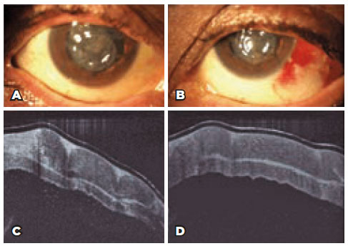 Another AMI to treat the persistent corneal epithelial defect was performed. The patient was treated with artificial preservative-free tears, heterologous serum eye drops 6 times per day, and 10 mg of oral nicergoline each 12 hours(4). However, the patient had another corneal perforation at 3 months of follow-up, 2 weeks after developing a descemetocele. A tectonic scleral graft was implanted (Figure 3). The evolution of the patient was not as good as expected. In August, she developed endophthalmitis again, with severe corneal melting, and choroidal detachments, with null response to treatment. Unfortunately, she was finally eviscerated.