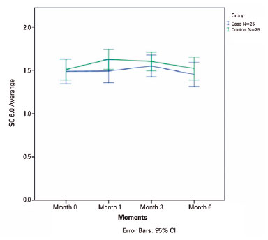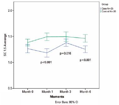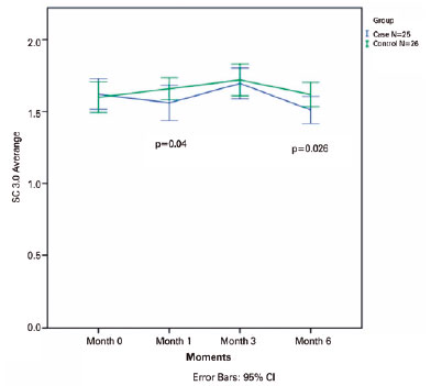 Those changes were significant at 1.5 cpd (p=0.004) in the SG and at 1.5 cpd (p=0.017), 6 cpd (p=0.007), and 18 cpd (p=0.001) in the CG. A comparative analysis of changes in CS between the groups showed significant differences at month 1 in 1.5 (p=0.000) and 3.0 cpd (p=0.04), in favor of the SG.