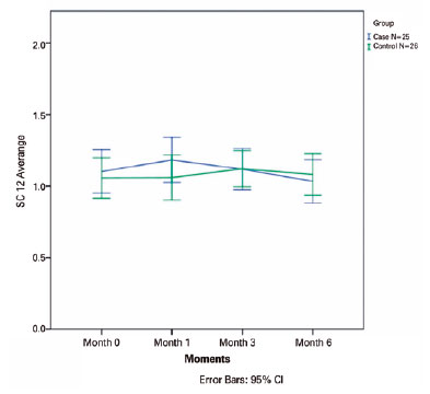 At month 3, CS was increased in the SG by 0.113 in 1.5 cpd, 0.042 in 3 cpd, 0.073 in 6 cpd, 0.031 in 12 cpd, and 0.011 in 18 cpd. In the CG, there was an increase by 0.017 in 1.5 cpd, 0.111 in 3 cpd, 0.120 in 6 cpd, 0.062 in 12 cpd, and 0.012 in 18 cpd. A comparative analysis of changes in CS between the groups did not show statistically significant differences at month 3.
