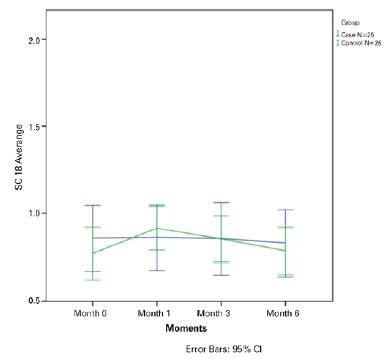At month 6, CS was increased in the SG by 0.012 in 1.5 cpd, and decreased by 0.151 in 3 cpd, 0.025 in 6 cpd, 0.092 in 12 cpd, and 0.037 in 18 cpd. In contrast, the CS in the CG increased by 0.065 in 1.5 cpd, 0.028 in 3 cpd, 0.013 in 6 cpd, 0.038 in 12 cpd, and 0.027 in 18 cpd. A comparative analysis of changes in CS between the groups showed statistically significant differences at month 6 in 18 cpd (p<0.05).