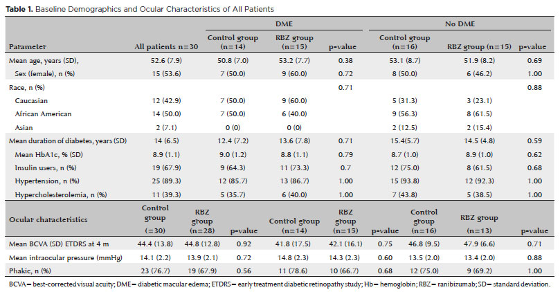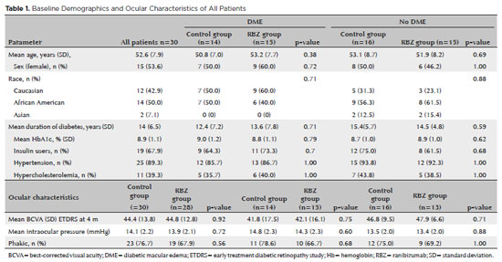 For the 30 patients enrolled, the mean ± standard deviation (SD) age and time from diabetes mellitus diagnosis were 52.3 ± 7.8 years and 14 ± 6.4 years, respectively. Mean ± SD glycated hemoglobin (HbA1C) level was 8.8 ± 1.1%. Patient demography and ocular characteristics are demonstrated in Table 1.