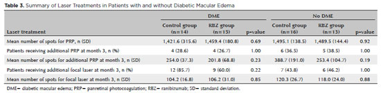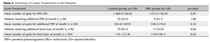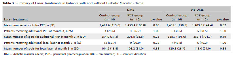 The baseline CG and SG included 30 eyes each, receiving a mean ± SD of 1,466.9 ± 202.6 spots for PRP. There was no statistically significant difference between the mean number of burns given in each group or among subgroups (patients with and without DME). Focal laser or additional PRP were allowed at month 3, when 33% and 32.1% of the patients in the CG and SG, respectively, required additional PRP. At 3-month follow-up, focal laser was performed in 63% and 53.6% of the patients, respectively. There was no significant difference in the proportion of eyes that received additional PRP or focal laser treatment in the two groups (p=1.00 and 0.60, respectively) (Tables 2 and 3).