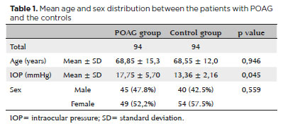 POAG was diagnosed in the patients before enrollment in the study. Patients who were using eye drops other than hypotensive medications after any ocular surgery and had <6 months of treatment with any glucocorticosteroid or immunosuppressive drugs were excluded from the study.