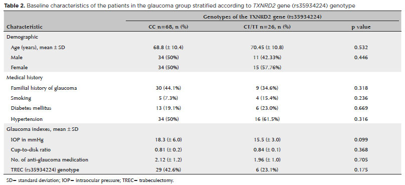 Methods: This was a cross-sectional study conducted to verify the association between the rs35934224 TXNRD2 (thioredoxin reductase 2) and primary open-angle glaucoma in a population from the Northeast region of Brazil. A total of 184 individuals were enrolled, including 94 with primary open-angle glaucoma (45 men and 49 women) and 94 controls (40 men and 54 women) from the Recife Eye Institute.