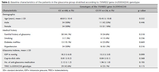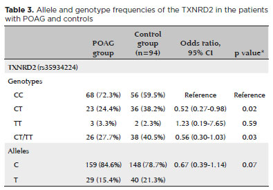 In the present study, we found a significant association between the CT genotype in the TXNRD2 gene (rs35934224) with protection to POAG in a Brazilian admixed population(15). On the other hand, we observed a higher frequency of the CC genotype in the POAG group than in the control group.