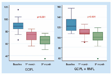 Resultados: A espessura média pré-operatória da camada plexiforme interna de células ganglionares e da camada plexiforme interna de células ganglionares ± camada de fibra nervosa da retina foi de 88,9 µm e 124,8 µm, respectivamente; a espessura média da camada plexiforme interna de células ganglionares com 1 mês e 3 meses após a cirurgia foi reduzida para 72,8 µm e 65,2 µm (p<0,001 e p<0,001, respectivamente). A espessura média da camada plexiforme interna de células ganglionares pós-operatórias + da camada de fibra nervosa da retina também foi reduzida com 1 e 3 meses (108,8 µm e 99,3 µm; p<0,001 e p<0,001, respectivamente). Nenhuma diferença significativa foi observada entre a acuidade visual melhor corrigida pré e pós-operatória com 1 e 3 meses (p <0, 73 e p<0, 14, respectivamente).