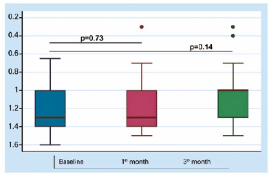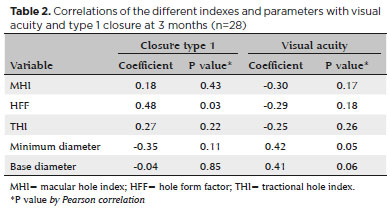 The mean BCVA changed from 1.2 ± 0.27 logMAR units at baseline to 1.2 ± 0.30 at 1 month and 1.1 ± 0.33 logMAR units at 3 months. No statistically significant changes were observed at 1 month (p=0.73) or 3 months (p=0.14) after the surgical procedure (Figure 2). The primary anatomical success rate was 92%, as two eyes required a second surgery due to failure of macular hole closure. The final anatomical success rate was 100%. Of the different indexes and parameters, the HFF presented a statistically significant moderate correlation (p<0.05) with type 1 closure (Table 2).