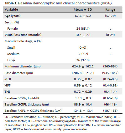 Significant correlations between several OCT indexes (MHI, THI, and HFF) and postoperative BCVA have been reported in other studies(19,20,44). Our study shows a trend similar to the aforementioned results, but it was not significant (Table 2). Contrary to our outcomes, those in other studies showed a strong correlation between MHI and postoperative BCVA as compared with other indexes(19,44,45). Among several OCT indexes, we found a significant correlation between HFF (p=0.03) and closure type 1. However, other reports found that MHI strongly correlated with type 1 closure(45). Determining the associations of several MH indexes with postoperative BCVA and closure type were not the primary objective of our study, and the small sample size could also explain this difference. The observation period was short (3 months), and the entire retinal thickness was reported to continue to diminish up to 24 months(46). Even so, we report a significant reduction in GCC thickness in this short period, and longer follow-up periods are needed. Finally, the limitations of this study include its small sample size and design, the lack of a control group, and the short follow-up period.