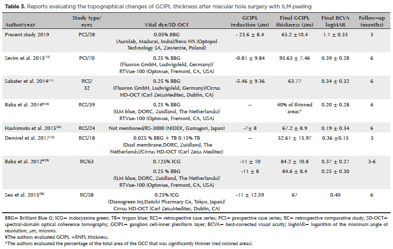 We found that the reduction of the mean GCC (GCIPL and GCIPL + RNFL) thickness was evident 3 months after surgery, and several authors (described in Table 3) reported the same reduction in GCIPL and RNFL thicknesses in patients who underwent ILM peeling (assisted with Brilliant Blue staining) at 3 and 6 months(10,11,13,24-27). However, Sevim et al. reported no significant reduction in the mean GCIPL thickness after BBG-assisted ILM peeling(12). Others studies used ICG stain as a vital dye and reported a significant thinning of the RNFL(28). Baba et al. compared the BBG and ICG stains and showed a significant reduction of the GCC at 6 months, but the retinal sensitivity and visual acuity were better in the patients in whom BBG staining was used during the vitrectomy(29). Some studies found a significant thinning of the temporal retina only in the eyes with ILM peeling(29,30). The mechanisms by which the GCC became progressively thinner after IMH surgery with ILM peeling are unclear. Our study did not determine whether the ILM peeling is directly responsible for the reduction of the thickness of the GCC because we did not include a non-ILM-peeling group. However, we believe that the direct mechanical damage to the ILM during the peeling rather than the cytotoxicity of the dye may have played a greater role in the GCC thinning postoperatively. The ILM is the basement membrane of the Müller cells, and the damage that occurs to these cells after ILM peeling has been electroretinographically and histologically demonstrated(31,32). After the ILM peeling, retinal fragments can be observed on the retinal surface, regardless of the use BBG or ICG; this may lead us to believe that the mechanical traction from the pulling of the Müller cells during the peeling can be transmitted to the inner retina, damaging the entire region(33). ILM peeling is also associated with microscotomas and reduced retinal sensitivity(14,15,34). ILM peeling has been associated with dissociated optic nerve fiber layer (DONFL), which is seen in blue filter photography as a hatched retina with striae along the optic nerve fibers; these are dimples in the inner layers that are visible on OCT(14,35,36). The idea of minimizing the iatrogenic trauma associated with ILM peeling can be achieved by decreasing the area to be peeled, which is reported by Michalewska et al. as a temporal ILM flap. With this technique, the risk of surgical trauma in the area of the papillomacular bundle is reduced, and unnecessary trauma to the RNFL is minimized; in addition, patients with a temporal ILM flap have a lower incidence of DONFL(37). However, DONFL has not been consistently associated with reduced visual acuity or microperimetric changes, and DONFL may reflect the healing process of the weakened retinal structure after the peeling(35,37). Multiple dark dots over the RNFL were observed when the appearance of the DONFL was examined using en face SD-OCT and named “concentric macular dark spots” (CMDS)(38). Sabry et al. observed that after ILM peeling, two patterns of inner retinal layers changes occurred, CMDS with intact GCIPL and CMDS with localized defects in GCIPL; the latter was associated with a thinning of the GCIPL thickness at 6 months after surgery(39). The authors suggested that even with a successful anatomical closure, inner retinal defects may play a role in the reduced postoperative visual acuity gain(39).