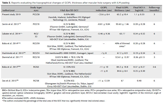 The innermost layers are the RNFL, ganglion cells (GC), and inner plexiform layer (IPL). These three layers correspond to the cell bodies, axons, and dendrites of GC, which in combination form the well-known ganglion cell complex. This complex serves as an early indicator of retinal damage due to the fact that these cells respond very early to ischemic changes(16). However, not much research has been conducted regarding the effect of these dyes during the peeling of the ILM on the GCC, and different outcomes have been reported(10,12). The recently available spectral-domain optical coherence tomography (SD-OCT) technology and algorithms provide better stratification and measurement of the GCC. The purpose of this report was to analyze the changes in the thickness of the macular GCC after macular hole surgery with the inverted flap technique.