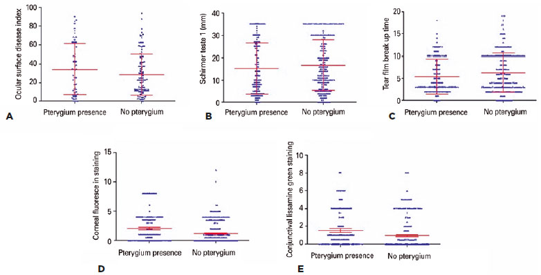 During the evaluation of the correlation between pterygium and DED criteria, no difference was noted between the pterygium group and the control group. However, an association was recorded with the staining tests CFLS and CGLS. Similarly, a study conducted in Spain in 2011 also noted no association with dry eye symptoms or similar signs, except for that by fluorescein staining(21). In contrast, a Chinese study in 2009 identified an association between pterygium and lower Schirmer’s test, tear breakup time, and the presence of dry eye symptoms(20).