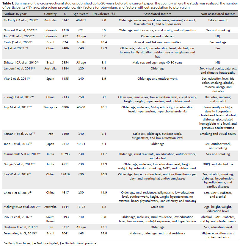 9. Fernandes AG, Salomao SR, Ferraz NN, Mitsuhiro MH, Furtado JM, Munoz S, et al. Pterygium in adults from the Brazilian Amazon Region: prevalence, visual status and refractive errors. Br J Ophthalmol. 2020;104(6):757-63.