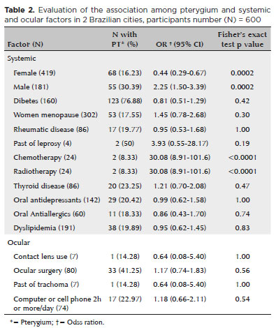 In conclusion, the frequency of pterygium in the 2 Brazilian populations was similar and high, approximately 20%, more frequently among men and older people. Fluorescein staining and white lissamine green staining were associated with pterygium. A positive correlation between pterygium and a history of chemotherapeutic and radiotherapeutic treatment was noted. However, there was a large discrepancy in the risk factors associated with pterygium, both in the epidemiological context (such as with respect to the sex and age) and clinical factors (such as diabetes and dyslipidemia) on comparing our findings with other studies, which emphasizes on the need for more comprehensive studies on this subject.