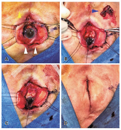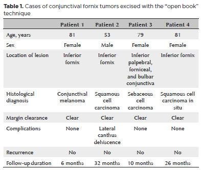 O manejo cirúrgico de grandes tumores envolvendo o fórnice conjuntival pode ser desafiador, onde a exposição e as margens livres podem ser difíceis de serem alcançadas. Nesta série de casos, relatamos nossa experiência inicial com 4 pacientes usando a técnica de livro aberto. Através da cantotomia e da cantólise, esta abordagem cirúrgica fornece um amplo campo cirúrgico e também facilita a reconstrução do fórnice após a excisão de um tumor grande. Em nossa série, um paciente apresentou deiscência no canto lateral.