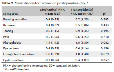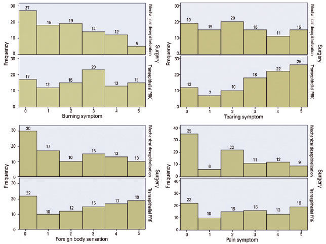 The pain response and other symptoms in the PRK group were measured using a self-administered questionnaire, with possible scores ranging from 0 (minimum value) to 5 (maximum symptom). The patients self-rated their pain response and other symptoms on the 5-point scale on the first and seventh days after surgery. We used non-parametric statistical tests, as we tested the normality of the quantitative variables of the main outcome using the Kolmogorov-Smirnov test and concluded that a normality distribution could not be assured. We used the Mann-Whitney test, considering a level of significance of 5%. We used the SPSS version 20 software for all statistical analyses, including graphs.
