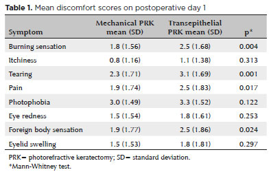 Conclusions: Our results showed that pain scores were significantly lower in the mechanical photorefractive keratectomy-treated eyes than in the transepithelial photorefractive keratectomy-treated eyes on postoperative day 1, which may have provided greater patient comfort after surgery and led patients to prefer the mechanical photorefractive keratectomy technique.