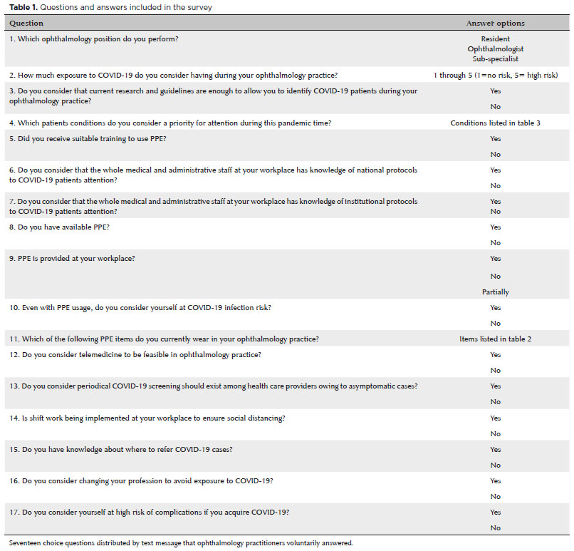 We conducted a self-administered, voluntary, anonymous survey using a questionnaire that comprised 17 questions (Google Drive forms) (Table 1). The forms were distributed via text messages to 777 ophthalmology practitioners working in México, Guatemala, El Salvador, Honduras, Colombia, Ecuador, Perú, and Argentina. The survey was open from May 01 to May 05, 2020. The data were extracted from Google Forms, and a database was created using the Statistical Package for the Social Sciences (IBM®SPSS® Statistics 2019 Chicago, IL USA). Student’s t-test was employed to determine the differences among the responses from different countries. A p value <0.05 was considered statistically significant; measures of descriptive statistics were also taken.