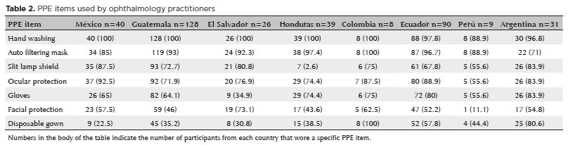 Conclusion: This survey has revealed the issues faced by ophthalmology practitioners in Latin America during their routine practice. These concerns and anxiety about COVID- 19 pandemic seem to be the same worldwide. It is important to reinforce the confidence of ophthalmology practitioners on current guidelines for attending COVID-19 patients. It is also necessary to conduct training programs on PPE usage and ensure that PPE items are available at all times to enhance the quality of care and minimize the spread of the disease.
