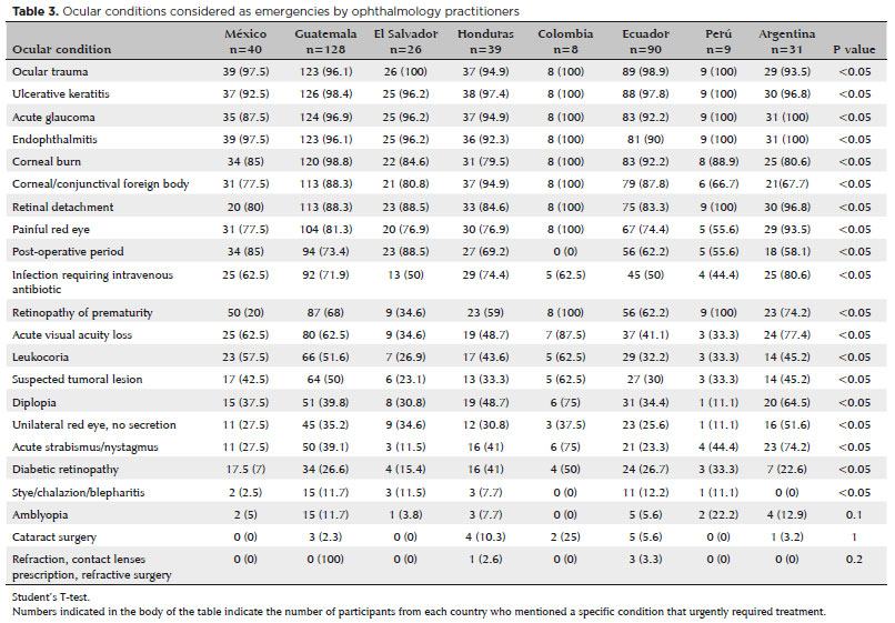 Conclusão: Esta pesquisa mostra a escassez de pessoal e treinamento específico que os praticantes de oftalmologia na América Latina enfrentam em sua prática diária. Essas preocupações e ansiedade parecem ser as mesmas em todo o mundo com a pandemia de COVID- 19. É importante reforçar a confiança dos profissionais de oftalmologia nas diretrizes atuais de atendimento ao paciente com COVID-19 e também disponibilizar programas de treinamento sobre o uso de EPI e também itens de EPI disponíveis em todos os momentos para garantir a qualidade do atendimento e a disseminação mínima da doença.