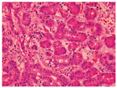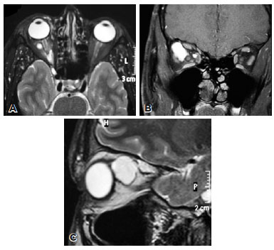 A 30-year-old male presented to the University Hospital of Ribeirão Preto for a follow-up examination after having undergone lateral orbitotomy elsewhere 2 years ago. According to him, the procedure had been performed to treat right eye proptosis, secondary to a large orbital mass. His past medical history was significant for multiple steroid injections into the right orbit for the management of a presumed orbital hemangioma during childhood. Examination of the right eye revealed no proptosis and unrestricted ocular motility. The funduscopic and visual field examinations were normal. Magnetic resonance imaging (MRI) showed multiple, large intraconal cysts in the right orbit. T1- and T2-weighted MRI revealed well-circumscribed masses around the right optic nerve with high signal intensity compared to the vitreous on T1W and T2W images (Figure 1). Histopathological evaluation of the sections of specimen obtained from the previous orbital surgery revealed ducts and acini of benign LGT (Figure 2) and absence of atypical cells, mitotic activity, and necrosis. No further intervention was planned as the patient was asymptomatic.