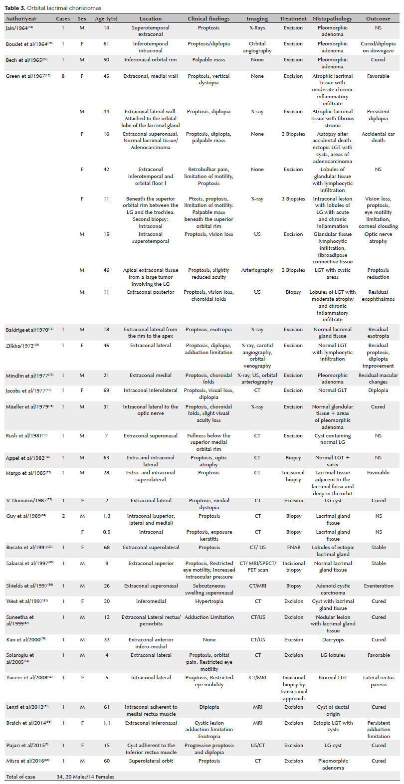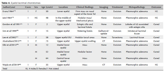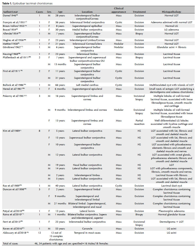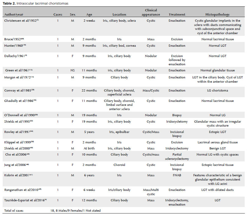 The occurrence of ectopic LGTs and intraocular lacrimal gland choristomas, as well as their progression into tumors, has been known since the 19th century. In 1891, Schirmer reported a case of conjunctival adenoma located between the insertion point of the medial rectus muscle and plica semilunaris(7). Puech is considered to be the first to have reported a choroidal adenoma in an adult female in 1887(10,14). A large number of LG choristoma cases have been published since these early reports. Although the present review is highly representative of the studies reported in the literature, it is not exhaustive. Some ancient papers could not be retrieved, and manuscripts written in European languages were not included. The analysis of the literature review described in this article is similar to that of a recent publication on the same subject(81) where it has been presented in a more condensed form.