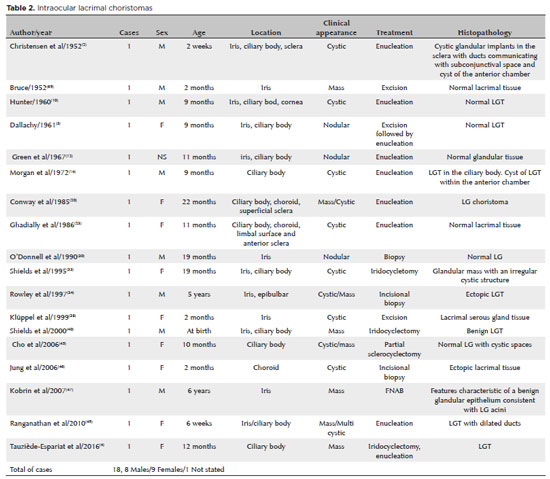 A question is whether ectopic LGT lesions are choristomas. The term choristoma is derived from the Greek word choristos (separated)-a tumor-like growth of microscopically normal tissue presents in an abnormal location(82). The LG is located in the orbital lacrimal fossa. Accessory LGs are present in the superior and inferior conjunctival fornix (glands of Krause), along the nonmarginal border of the tarsal plates (glands of Wolfring), and in the plica semilunaris and the caruncle(83). Thus, LGT lesions should be considered choristomas only if found outside these locations. Table 2 presents the cases of intraocular lacrimal choristomas found at different locations, as reported by several authors over the years. Ectopic LGT lesions might be a result of changes in the accessory lacrimal glands as in the case reported by Boase and Bullock who found an “ectopic” lacrimal cyst involving the caruncle or the medial aspect of the conjunctiva near the plica(8,24).