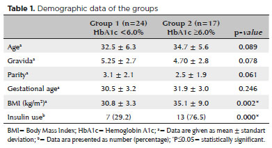 Information regarding the patients’ age, number of pregnancies and live births, gestational age, body mass index (BMI), HbA1c levels, insulin use, and diet was recorded. They were divided into two groups according to their HbA1c level (group 1: HbA1c <6.0%; group 2: HbA1c ≥6.0%).