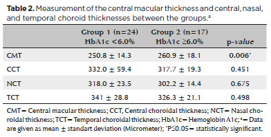 Conclusões: Embora os valores do índice de massa corporal e da espessura macular central tenham sido significativamente maiores no Grupo 2 com hemoglobina A1c alta, não houve diferenças nas medidas de espessura coroidal central, nasal e temporal entre os dois grupos.