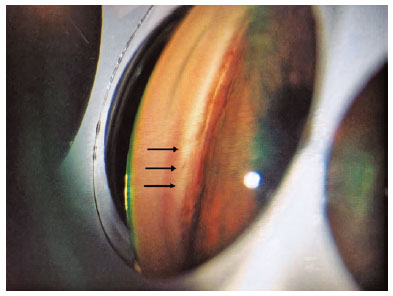 KDB goniotomy was performed after completion of the cataract surgery with intraocular lens implantation, in accordance with the manufacturer’s directions for use, with the assistance of a Swan-Jacob gonio prism. The TM was excised in the 4 to 5 o’clock position nasally. Postoperatively, 1% prednisolone acetate suspension, 0.5% moxifloxacin solution, and 0.5% ketorolac solution were prescribed. After 1 week, moxifloxacin therapy was discontinued, and the remaining medications were terminated 3 weeks later. The patients who received topical ocular hypotensive agents were advised to maintain their use, but the use of eye drops was suspended depending on the postoperative IOP measurements.