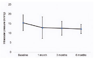 The mean IOP was significantly reduced from baseline to 6 months after operation (p<0.001), from 15.5 ± 4.2 mmHg to 12.2 ± 2.4 mmHg (Figure 2). The mean number of topical hypotensive medications also decreased significantly from baseline to 6 months after operation (p<0.001), from 1.9 ± 1.0 to 0.6 ± 1.0 at the last visit. The mean preoperative and postoperative best-corrected visual acuity values were 0.5 ± 0.2, and 0.9 ± 0.1 (Snellen chart), respectively, showing a significant improvement after the intervention (p=0.004).