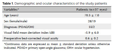 Results: A total of 47 patients (57 eyes) were included (mean age, 70.5 ± 7 years). The mean intraocular pressure was reduced from 15.5 ± 4.2 mmHg to 12.2 ± 2.4 mmHg at the last follow-up visit (p<0.001). The mean number of antiglaucoma medications decreased significantly from 1.9 ± 1.0 to 0.6 ± 1.0 during the same period (p<0.001). On the basis of the predefined criterion (intraocular pressure reduction ≥20% and/or reduction ≥1 medication), the 6-month success rate was 86%. A higher preoperative intraocular pressure value (odds ratio [OR]= 2.01; p=0.016) and greater percentage of initial (30 days) intraocular pressure reduction (OR= 1.02; p=0.033) were significantly associated with surgical success.